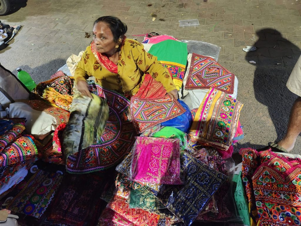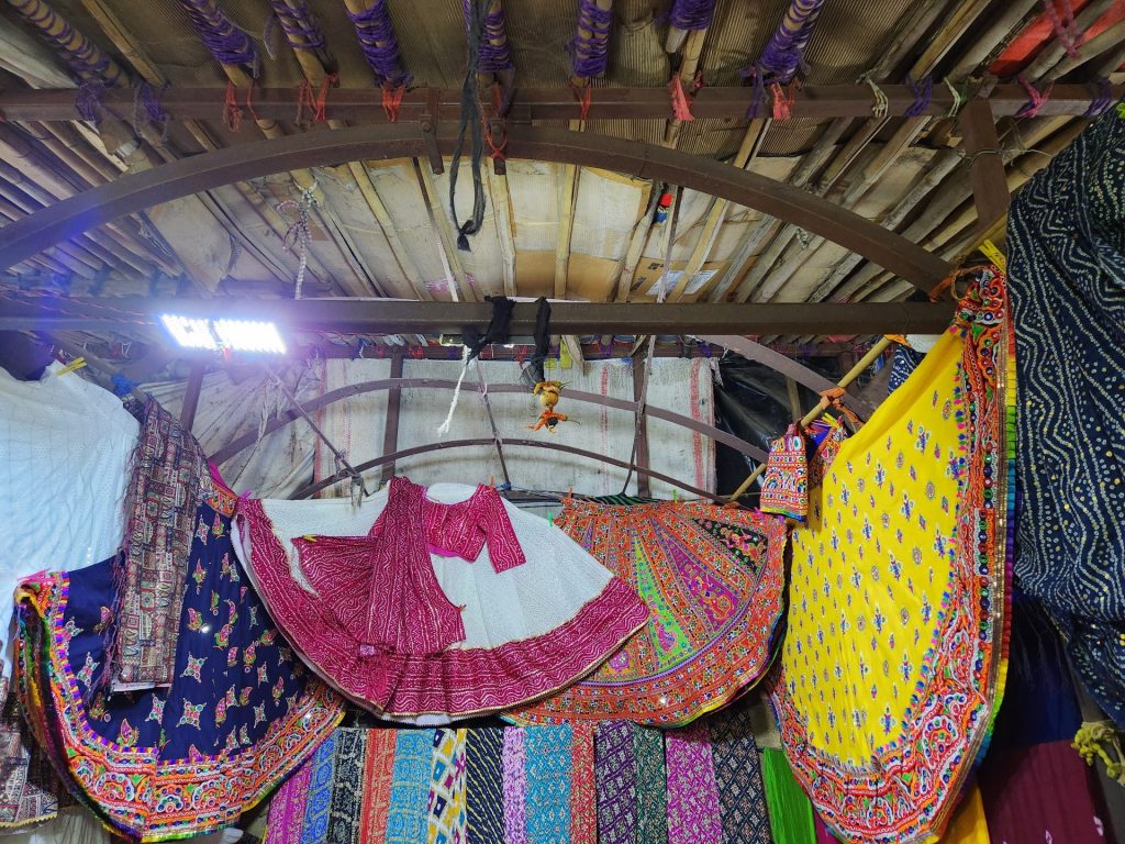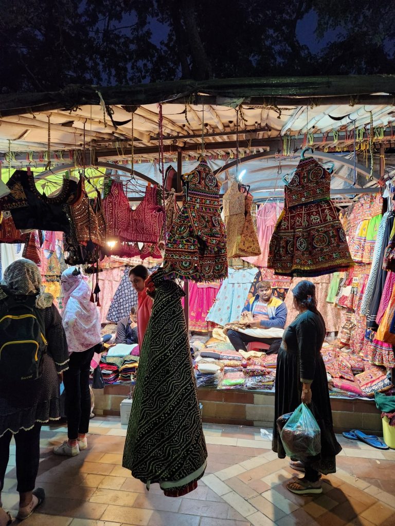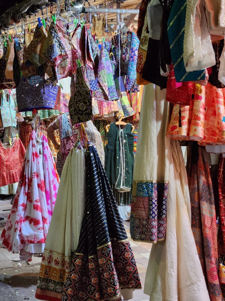 The left hand side of the market has a wide variety of shops selling intricately designed mats to table covers, bags, wall hangings, handicrafts, silver oxidized jewellery, mix of ethnic and traditional wear ranging from the mirrored work Chaniya Cholis to the Lehariyas to the Bandhnis. The opposite side is where one can indulge more in Western wear, tops, jeans, skirts, footwear etc. Not to mention the number of eateries dishing out traditional Gujarati street food. One could easily spend a couple of hours going around these markets and checking out the wide variety of stuff on offer. Do however remember to negotiate hard on the prices.