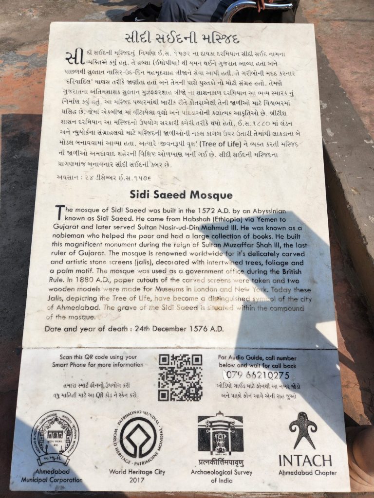This design inspired the Indian Institute of Ahmedabad to design their Logo around this pattern. A marble plaque found within the premises states that this mosque owes it origins to Siddi Sayed who built it during the last year of the Gujarat Sultanate before they were defeated by the Mughals who then took over the city.