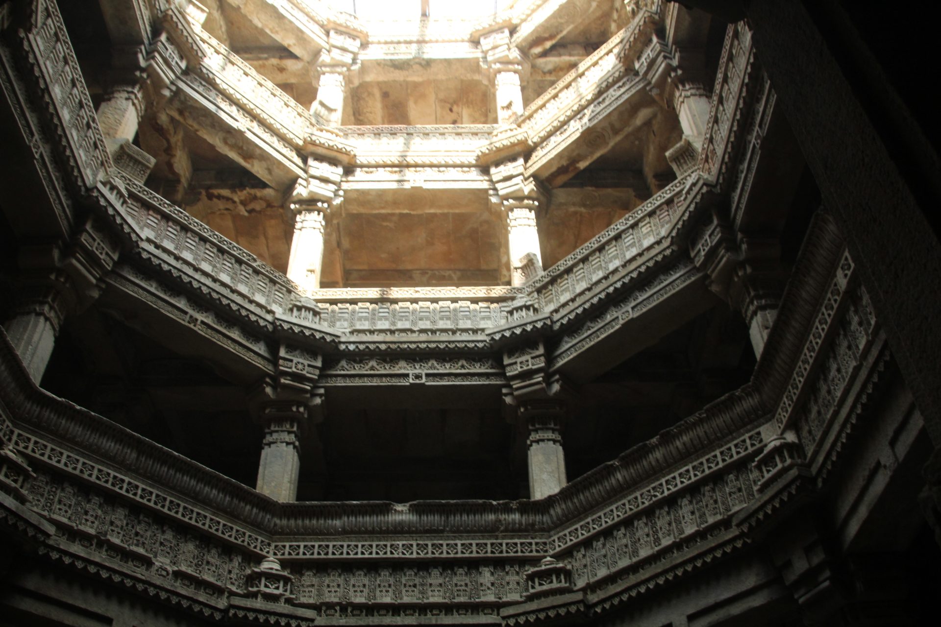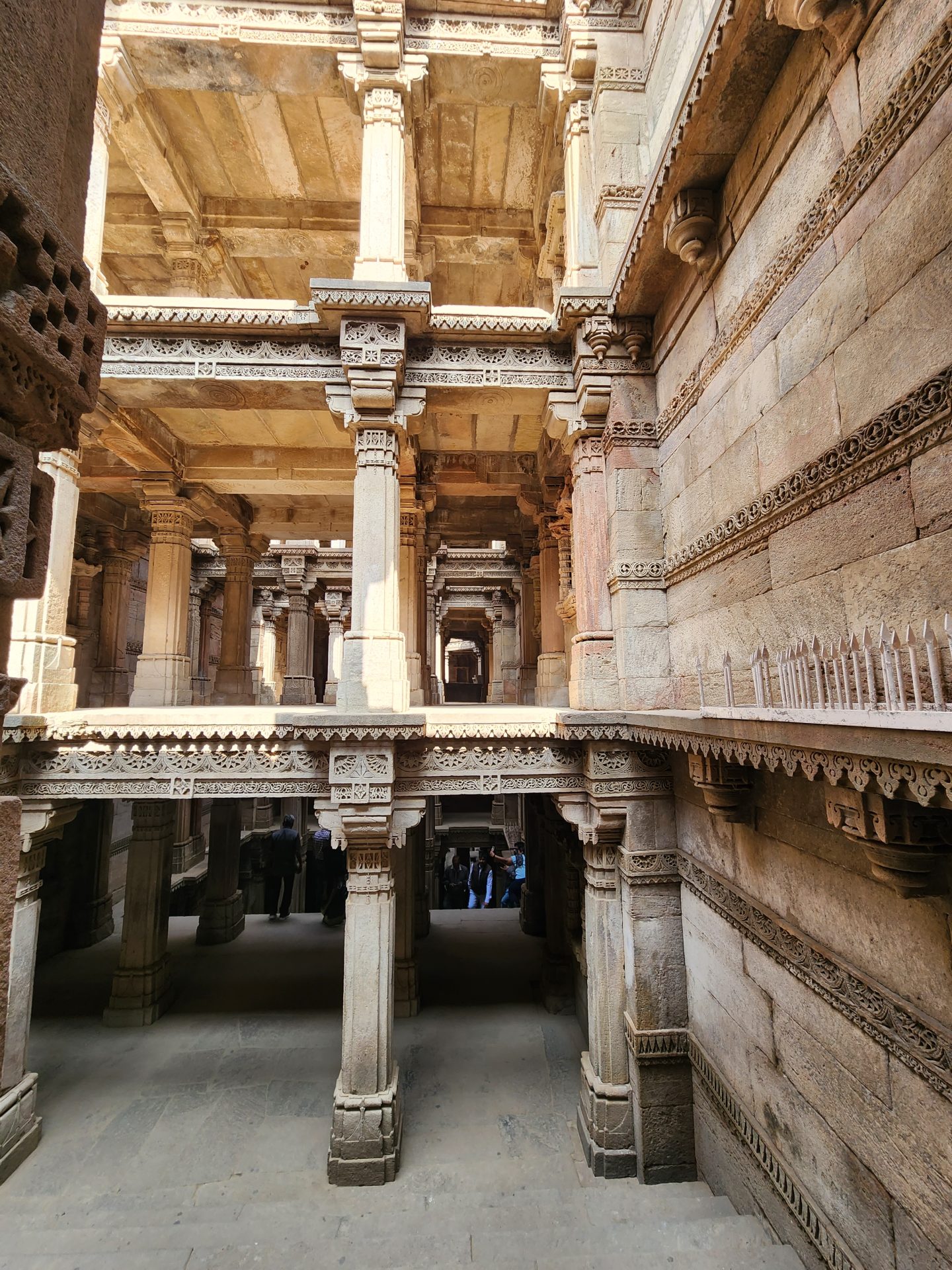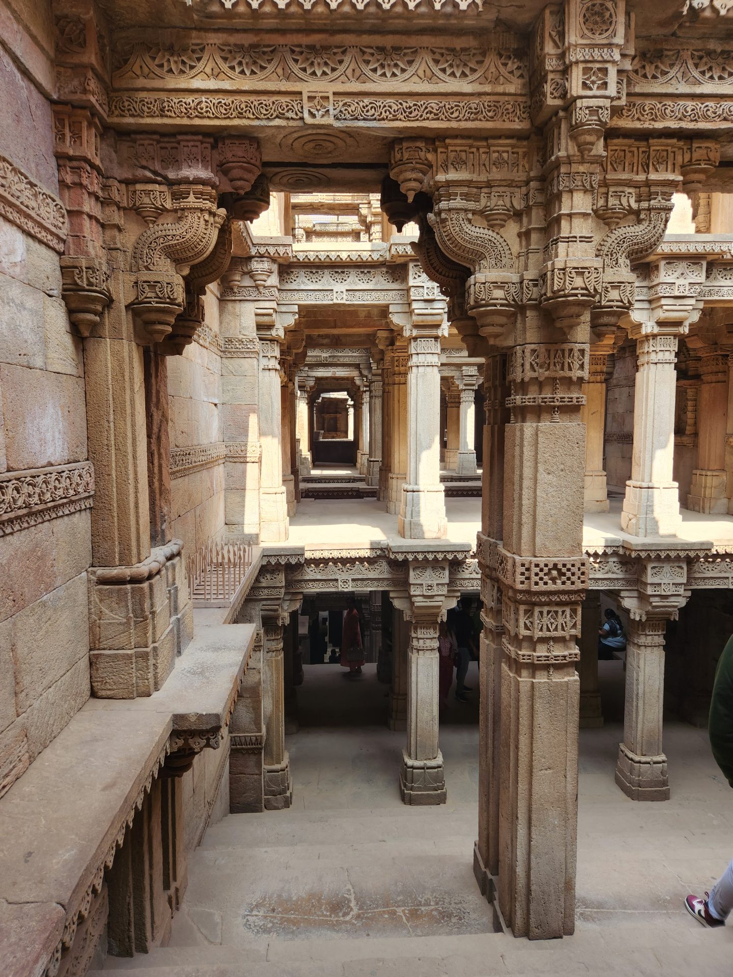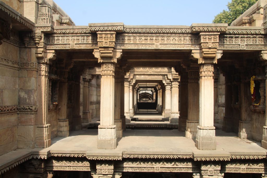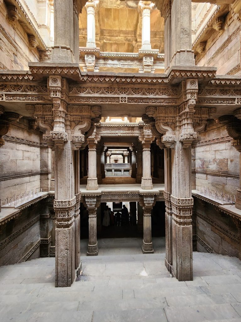 Built on intricately carved pillars over 5 floors, each floor has enough space for a number of people to congregate and to reach the water level of the well, one has to climb down 3 floors.