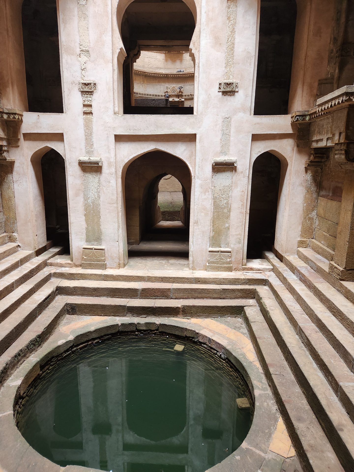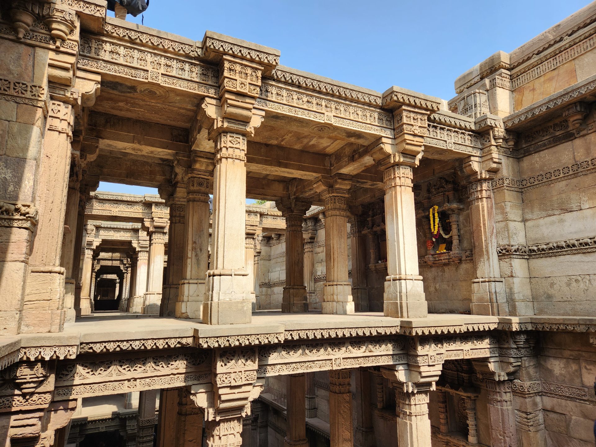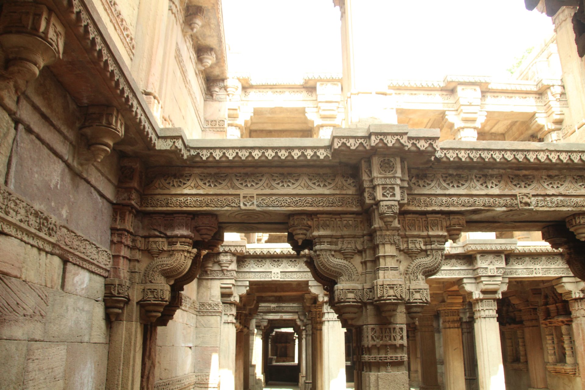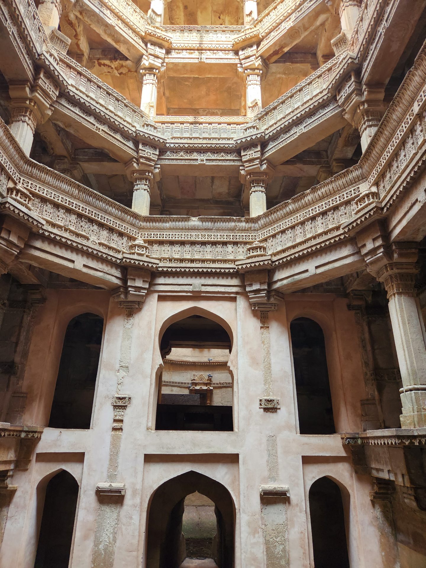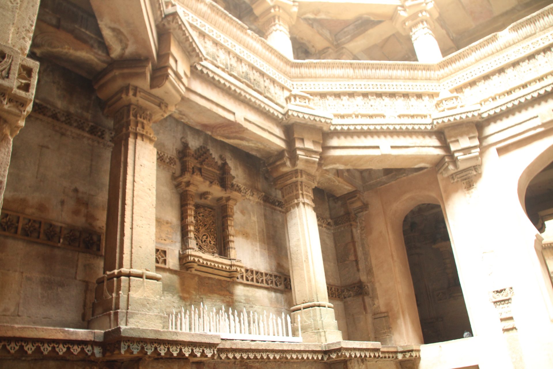 Built on intricately carved pillars over 5 floors, each floor has enough space for a number of people to congregate and to reach the water level of the well, one has to climb down 3 floors.