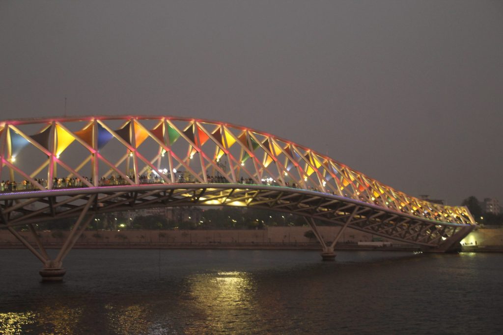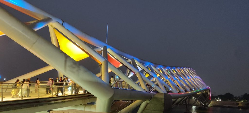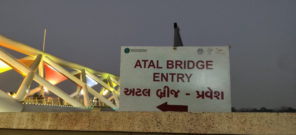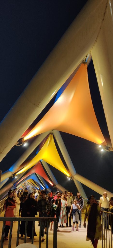 The Atal bridge comes alive with people walking from one end of the bridge to the other and the multi-colored lights across the bridge which come on around dusk make for a fascinating sight.