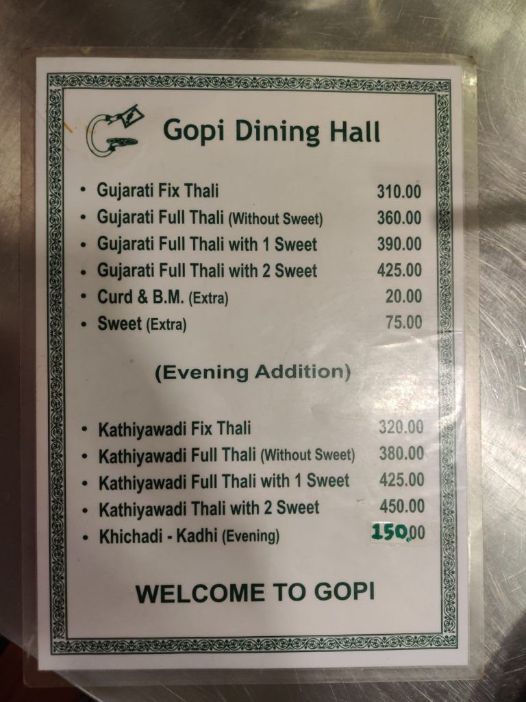 After a little bit of rest and freshening up, we stepped out of the hotel in search of that elusive Gujarati Thali. While our hotel had a good restaurant by the name of Leaf, the cuisine was more continental while our search was for desi Gujju food. The hotel folks directed us to Gopi Dining Hall on Ashram Road and not very far away. A traditional no nonsense dining hall with a decent ambience and some good wholesome homely food served by over eager waiters who just didn’t want to stop serving.