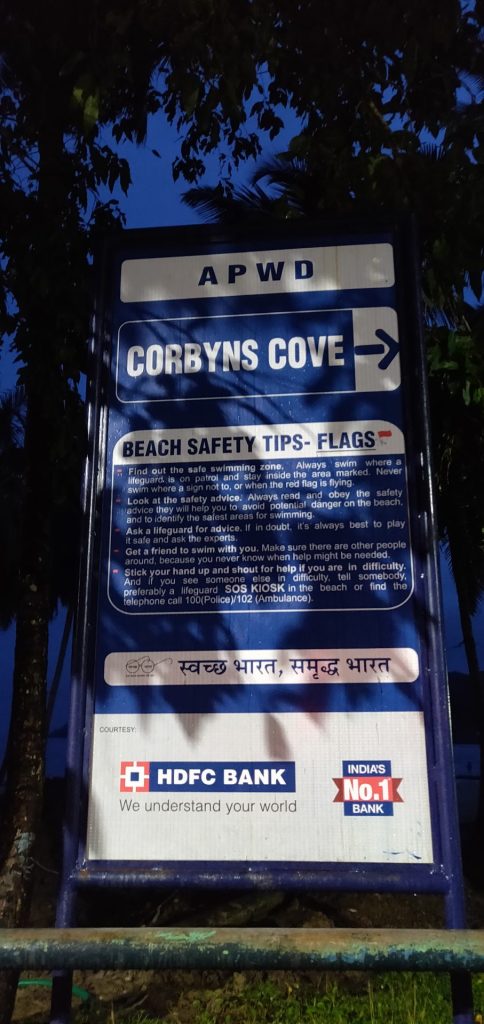 After spending around an hour and a half and post all the photo shoots, we headed for Corbyn’s Cove which was around 21 kms away and entailed a 30 minute travel. This is the only developed beach in Port Blair and the shoreline has a lot of palm trees. We were there at the beach till around 5.30 PM in the evening and headed back to our hotel, 8 kms away from this place.