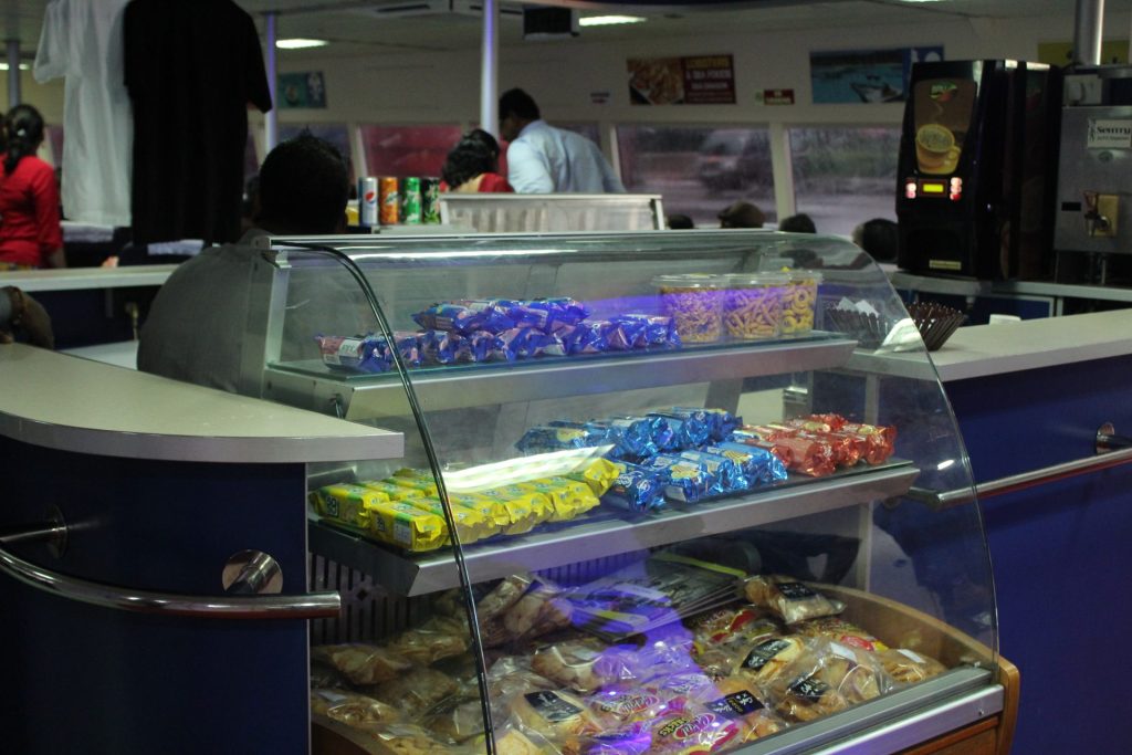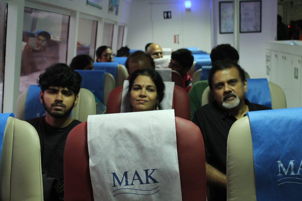 The air conditioned ferry travels at a maximum speed of 30 nautical miles per hour and the large windows offer mesmerizing views of the blue ocean. We alighted at the Govind Nagar Ferry junction and after collecting our luggage, spent some time photographing the beautiful views on offer. The ferry tickets costed us roughly 1,500/- per person and included a sandwich and coffee.